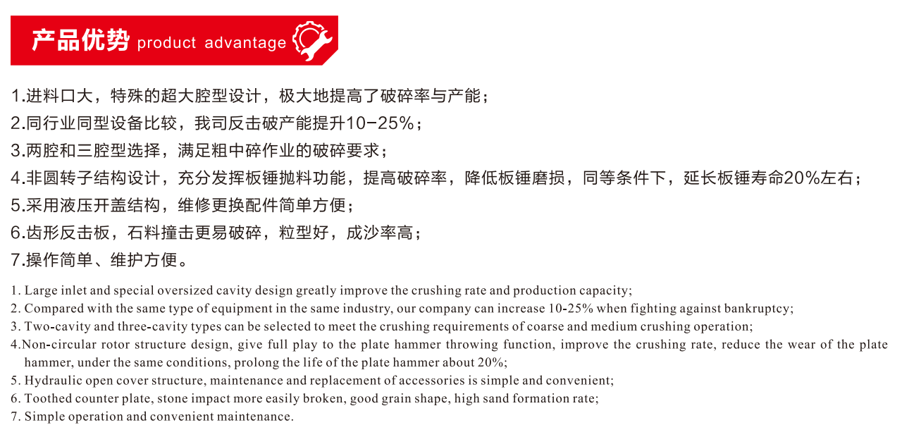 本系列產品是我公司總結吸收國內外先進技術的基礎上,經優化設計而研制出的一款新型三腔反擊式破碎機。廣泛應用于高速公路建設、水利工程、建筑碎石、機制砂加工等領域。適用于抗壓強度不超過200Mpa各類物料的破碎,如青石、石英石、石灰石等。